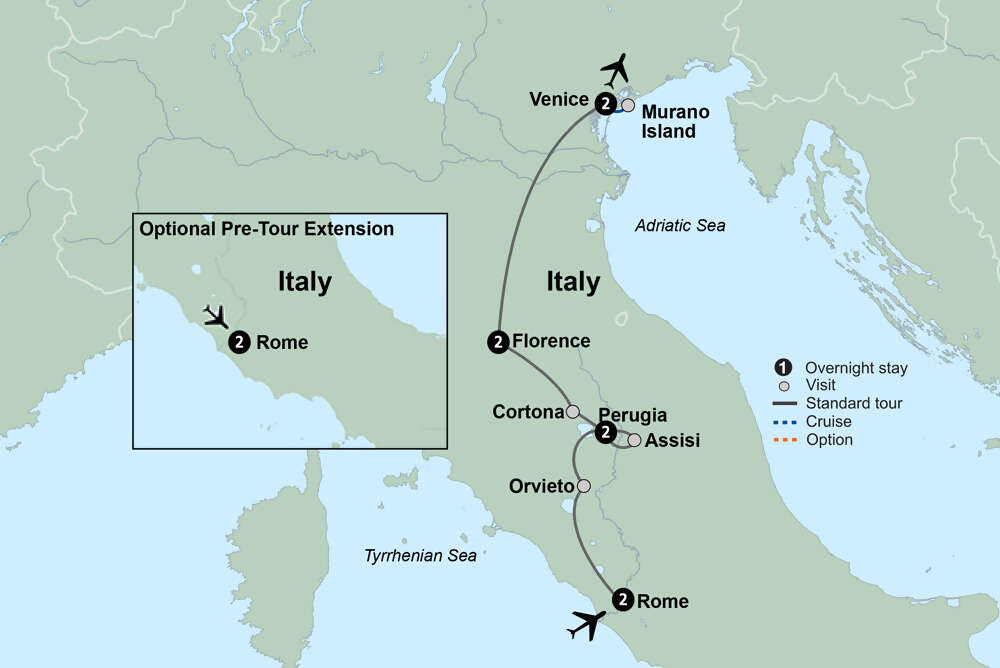 Embark on a captivating journey that takes you from the piazzas of Rome to the canals of Venice. Discover the rolling hills of the scenic Tuscan and Umbrian countryside. Explore medieval hill towns and visit Assisi, the birthplace of St. Francis. Spend time at a historic winery in the heart of the Chianti region and enjoy a chef-led cooking class with lunch. Discover the masterpieces of the Renaissance in Florence. See glass transformed into exquisite art on Murano Island. Linger in iconic Venice for two nights. Encounter a land rich in history, culture, art, and romance.